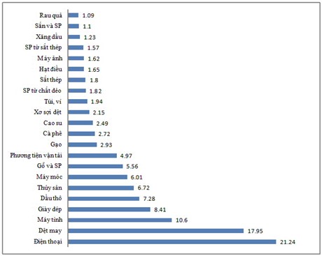 Theo số liệu mới nhất của Tổng cục Hải quan, năm 2013 có 22 mặt hàng xuất khẩu đạt kim ngạch từ 1 tỷ USD trở lên.