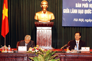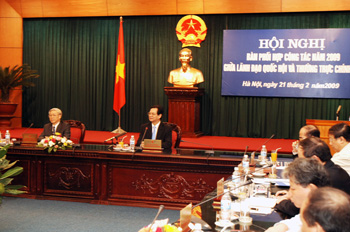 | | | Thủ tướng Chính phủ Nguyễn Tấn Dũng và Chủ tịch Quốc hội Nguyễn Phú Trọng tại Hội nghị - Ảnh Chinhphu.vn | Thời gian qua, sự phối hợp công tác giữa Lãnh đạo Quốc hội và Thường trực Chính phủ ngày càng mang tính chủ động, linh hoạt, kịp thời, thiết thực và hiệu quả hơn. Cùng với đó, các đại biểu dự Hội nghị cũng đánh giá cao vai trò chủ động tham mưu của Văn phòng Quốc hội và Văn phòng Chính phủ đã góp phần tăng cường hiệu quả của công tác chỉ đạo điều hành của Chính phủ, đồng thời nâng cao chất lượng các kỳ họp Quốc hội, các phiên họp của Ủy ban Thường vụ Quốc hội. Phối hợp ngày càng hiệu quả, linh hoạt Năm 2008, trước yêu cầu tập trung xử lý nhiều công việc lớn, cấp bách của đất nước, Lãnh đạo Quốc hội và Thường trực Chính phủ đã tăng cường phối hợp công tác thường xuyên, hạn chế sự trùng lặp, chồng chéo về nội dung. Sự phối hợp chỉ đạo chặt chẽ giữa Lãnh đạo Quốc hội và Thường trực Chính phủ đã bảo đảm sự chủ động, kịp thời trình Quốc hội xem xét, quyết định các vấn đề quan trọng của đất nước cũng như xử lý các vấn đề phát sinh đột xuất trong quá trình điều hành kinh tế xã hội. Các đại biểu đánh giá, Thủ tướng Chính phủ Nguyễn Tấn Dũng trả lời trực tiếp chất vấn của đại biểu Quốc hội đã giải đáp trọn vẹn mọi mối quan tâm, kể cả những băn khoăn của nhân dân đối với những vấn đề trong quá trình điều hành kinh tế-xã hội đất nước, đồng thời đây cũng chính là thành công của Quốc hội. Tuy vậy, đứng trước yêu cầu mới, ngày càng cao của sự phát triển, sự phối hợp giữa Lãnh đạo Quốc hội và Thường trực Chính phủ còn một số hạn chế nhất định. Cụ thể, việc xây dựng các chương trình công tác có thời điểm còn bị động, chưa hợp lý; thời gian và nội dung phiên họp Lãnh đạo Quốc hội và Thường trực Chính phủ có lúc chưa phù hợp với việc triển khai công việc của hai bên. Việc chuẩn bị chương trình xây dựng luật, pháp lệnh hàng năm và cả nhiệm kỳ chưa được chú trọng, đầu tư đúng mức để đảm bảo tính khả thi. Một số dự án luật, pháp lệnh chuẩn bị chưa kỹ, dẫn đến việc triển khai thực hiện các Nghị quyết của Quốc hội gặp nhiều khó khăn. | | | Toàn cảnh hội nghị - Ảnh Chinhphu.vn | Ý kiến đại diện Văn phòng Quốc hội và Văn phòng Chính phủ cho rằng, trước khi đưa dự án luật, pháp lệnh vào chương trình xây dựng hàng năm, cần xem xét kỹ phạm vi, đối tượng điều chỉnh của từng dự án, xác định mức độ tác động đến kinh tế - xã hội khi dự án luật được thông qua để ưu tiên những dự án thực sự cần thiết. Bên cạnh đó, công tác giám sát của Quốc hội, Ủy ban Thường vụ Quốc hội cần tập trung vào các chuyên đề chuyên sâu, có kiến nghị cụ thể về việc sửa đổi, bổ sung các văn bản luật, pháp lệnh và công tác thi hành luật. Hoạt động chất vấn và trả lời chất vấn của các thành viên Chính phủ tại kỳ họp Quốc hội, các phiên họp Ủy ban Thường vụ Quốc hội cần tiếp tục được cải tiến, đổi mới. Một số ý kiến cho rằng, cần rà soát tổng thể công tác xây dựng pháp luật của nước ta hiện nay. Theo đó, các Bộ, ngành phải thực hiện đúng chương trình xây dựng luật, pháp lệnh, văn bản quy phạm pháp luật. Các đại biểu có mặt trong phiên họp bày tỏ ý kiến đánh giá cao chủ trương, giải pháp và công tác chỉ đạo điều hành của Chính phủ trong thời gian qua nhằm ngăn chặn suy giảm kinh tế, ổn định kinh tế vĩ mô, duy trì tăng trưởng hợp lý và bảo đảm an sinh xã hội. Kịp thời xem xét, phối hợp giải quyết những vấn đề phát sinh, đột xuất Lãnh đạo Quốc hội chia sẻ với Thường trực Chính phủ về những khó khăn, thách thức và những vấn đề phát sinh đặt ra đối vối công tác chỉ đạo, điều hành kinh tế xã hội, tiếp tục đưa đất nước phát triển theo đường lối của Đảng và Nghị quyết của Quốc hội đã đề ra. Các đại biểu thống nhất: Bộ Tư pháp và Văn phòng Chính phủ có vai trò rất quan trọng trong việc thẩm tra, lấy ý kiến, trình các dự án luật. Bên cạnh đó, cần tăng cường củng cố cơ quan pháp chế của các Bộ, ngành, góp phần xây dựng dự án luật đạt chất lượng ngay từ khâu đầu. Các đại biểu cũng cho rằng: Năm 2009 và những năm tiếp theo Lãnh đạo Quốc hội và Thường trực Chính phủ cần có sự thống nhất phối hợp công tác một cách cụ thể, chi tiết. Chẳng hạn việc bố trí lịch họp của Ủy ban Thường vụ Quốc hội và lịch họp Chính phủ không trùng thời điểm; trong kỳ họp thứ 5 Quốc hội khóa XII sắp tới, Quốc hội sẽ xem xét và thông qua 13 dự án Luật, vì vậy trước 10 ngày diễn ra kỳ họp này Lãnh đạo Quốc hội và Thường trực Chính phủ cần trao đổi, thống nhất công tác chuẩn bị thật chi tiết. Chủ tịch Quốc hội Nguyễn Phú Trọng n