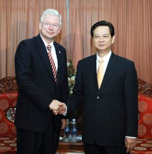 |  | | Thủ tướng Nguyễn Tấn Dũng tiếp đồng chí Uông Dương, Ủy viên Bộ Chính trị ĐCS Trung Quốc, Bí thư Tỉnh ủy Quảng Đông - Ảnh: Cổng TTĐT Chính phủ | Thủ tướng Nguyễn Tấn Dũng và Bí thư Tỉnh ủy Quảng Đông Uông Dương bày tỏ vui mừng trước những bước phát triển mạnh mẽ trong quan hệ giữa 2 nước Việt Nam và Trung Quốc theo đúng phương châm 16 chữ vàng và tinh thần 4 tốt mà lãnh đạo cấp cao của 2 nước đã thống nhất. Thủ tướng Nguyễn Tấn Dũng cho rằng, chuyến thăm Việt Nam lần này của Đoàn đại biểu Đảng, Chính quyền và trên 600 doanh nghiệp của tỉnh Quảng Đông sẽ mở ra nhiều cơ hội và triển vọng mới trong quan hệ hợp tác giữa Việt Nam -Trung Quốc nói chung và giữa các Bộ ngành, địa phương của Việt Nam với tỉnh Quảng Đông nói riêng vì lợi ích và sự phát triển chung của nhân dân hai nước. Nhân dịp này, thay mặt Chính phủ Việt Nam, Thủ tướng Nguyễn Tấn Dũng chúc mừng Trung Quốc đã tổ chức thành công Thế vận hội Bắc Kinh 2008. Bí thư Tỉnh ủy Quảng Đông Uông Dương cảm ơn sự đón tiếp trọng thị của Thủ tướng dành cho Đoàn và thông báo với Thủ tướng Nguyễn Tấn Dũng một số kết quả làm việc của Đoàn với lãnh đạo các Bộ, ngành của Việt Nam như Bộ Công Thương, Bộ Kế hoạch và Đầu tư, Phòng Thương mại và Công nghiệp Việt Nam… Đồng chí Uông Dương bày tỏ mong muốn Chính phủ Việt Nam ủng hộ và tạo điều kiện thuận lợi để Quảng Đông sớm triển khai dự án xây dựng khu kinh tế-thương mại tại Hải Phòng; các chương trình hợp tác khai thác cũng như chế biến khoáng sản…đề nghị thiết lập một cơ chế đối thoại và trao đổi thông tin thường xuyên giữa Quảng Đông với một số Bộ, ngành, địa phương của Việt Nam. Thủ tướng Nguyễn Tấn Dũng nhấn mạnh, Quảng Đông và các Bộ, ngành, địa phương của Việt Nam cần tích cực triển khai những thỏa thuận hợp tác đã thống nhất và tích cực xây dựng những chương trình hợp tác mới trên tinh thần vừa là đồng chí, vừa là anh em. Thủ tướng tin tưởng mục tiêu đạt kim ngạch 2 chiều trên 2 tỷ USD trong năm 2008 giữa Việt Nam và Quảng Đông là hoàn toàn có thể thực hiện được. |  | | Thủ tướng Nguyễn Tấn Dũng và Thủ hiến bang Hessen Roland Koch - Ảnh: Cổng TTĐT Chính phủ | Tiếp Thủ hiến bang Hessen Roland Koch, Thủ tướng Nguyễn Tấn Dũng khẳng định, trong những năm qua quan hệ hợp tác song phương Việt Nam - CHLB Đức nói chung và với bang Hessen nói riêng có những bước phát triển hết sức mạnh mẽ. Hiện nay có rất nhiều doanh nghiệp của bang Hessen đang hoạt động có hiệu quả tại Việt Nam như Deutsche Bank, Sanofi-Aventis…; tổng kim ngạch thương mại giữa Việt Nam và bang Hessen năm 2007 đạt trên 130 triệu Euro. Thủ tướng nhấn mạnh, Việt Nam luôn khuyến khích và tạo điều kiện thuận lợi cho các doanh nghiệp của bang Hessen sang tìm hiểu cơ hội hợp tác và làm ăn lâu dài tại Việt Nam. Thủ tướng Nguyễn Tấn Dũng đánh giá cao sự ủng hộ quan trọng của bang Hessen và cá nhân ngài Thủ hiến đối với dự án xây dựng Trường Đại học Việt-Đức tại TP Hồ Chí Minh; cho rằng việc Thủ hiến trực tiếp sang khánh thành Trường Đại học Việt-Đức là sự kiện có ý nghĩa quan trọng trong quan hệ hợp tác giữa 2 nước, thể hiện sự cam kết cao của CHLB Đức đối với dự án và khẳng định Việt Nam sẽ nỗ lực thúc đẩy thực hiện thành công dự án này. Thủ hiến bang Hessen Roland Koch cho biết, trong thời gian tới, bên cạnh việc mở rộng hợp tác về giáo dục-đào tạo với các Bộ, ngành, địa phương của Việt Nam, các hoạt động hợp tác trong lĩnh vực kinh tế, thương mại sẽ được chú trọng và đẩy mạnh. Bang Hessen mong muốn sớm trở thành đối tác quan trọng của Việt Nam, Thủ hiến Roland Koch bày tỏ. Nguyễn Hoàng |