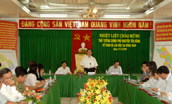 Thủ tướng biểu dương những thành tựu khá toàn diện của Đồng Tháp trong những năm gần đây, như: GDP tăng cao (năm 2008 16,56%); GDP bình quân đầu người đạt 615 USD/năm, sản lượng lúa đạt 2,72 triệu tấn, công – nông nghiệp đều tăng trưởng khá cao. Trồng lúa, nuôi và chế biến thủy sản (cá tra, cá basa, tôm) phát triển khá tốt. Tích cực xây dựng cụm tuyến dân cư vượt lũ. Tỷ lệ hộ nghèo giảm còn gần 6%, đời sống nhân dân được cải thiện. Tuy nhiên, Đồng Tháp vẫn còn những hạn chế như sản xuất lúa và nuôi trồng thủy sản còn bấp bênh, cơ sở hạ tầng yếu kém, hộ cận nghèo còn nhiều, còn ít lao động có tay nghề.