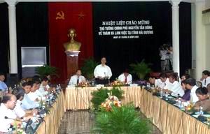 | | Thủ tướng Nguyễn Tấn Dũng và Đoàn công tác Chính phủ làm việc với lãnh đạo chủ chốt tỉnh Hải Dương Ảnh: Cổng TTĐT Chính phủ | Tham gia đoàn công tác có lãnh đạo Văn phòng Chính phủ, các Bộ: Kế hoạch và Đầu tư, Tài chính, Công Thương, Giao thông vận tải, Tài nguyên và Môi trường, Nông nghiệp và Phát triển nông thôn, Xây dựng. Thay mặt Chính phủ, Thủ tướng Nguyễn Tấn Dũng đã biểu dương những cố gắng, nỗ lực của Đảng bộ, các tầng lớp nhân dân Hải Dương đạt được thành tích khá toàn diện trên các mặt kinh tế - xã hội. Toàn tỉnh đã thu hút 188 dự án đầu tư nước ngoài với số vốn đăng ký hơn 2,1 tỷ USD. Việc huy động vốn đầu tư của toàn xã hội khá tốt. Nhờ đó, giá trị sản xuất công nghiệp 8 tháng đầu năm tăng 20,5% so với cùng kỳ năm trước; tổng mức bán lẻ hàng hóa và doanh thu dịch vụ tăng 23,5%; nông nghiệp được mùa, giá lương thực giảm 1,53%. Toàn tỉnh tiết kiệm chi thường xuyên 10%, đạt trên 15 tỷ đồng. Chú trọng công tác qui hoạch đô thị và nông thôn Hải Dương đứng thứ 2 toàn quốc về chất lượng giáo dục tiểu học; số hộ nghèo giảm rõ rệt. Từ đầu năm đến nay tỉnh đã chi hơn 8 tỷ đồng cho đào tạo nghề; giải quyết việc làm cho 16.000 lao động. Bên cạnh việc biểu dương những thành tích đã đạt được, Thủ tướng Nguyễn Tấn Dũng lưu ý một số mặt còn hạn chế của Hải Dương như: Chuyển dịch cơ cấu kinh tế còn chậm, nông nghiệp còn chiếm tỷ trọng cao trong cơ cấu kinh tế; tốc độ tăng trưởng nông nghiệp thấp; tỷ lệ lao động trong nông nghiệp còn quá lớn; dân số tăng nhanh; công tác bảo vệ môi trường còn nhiều bất cập. Thủ tướng Nguyễn Tấn Dũng cho rằng, Hải Dương cần phát huy mạnh mẽ hơn nữa lợi thế nằm trong địa bàn kinh tế trọng điểm phía Bắc, vùng Hà Nội, có hệ thống giao thông thuận lợi với 5 tuyến quốc lộ quan trọng chạy qua; chỉ cách thủ đô Hà Nội 57 km, cảng Hải Phòng 45 km, cảng Cái Lân 80 km để thúc đẩy mạnh mẽ chuyển dịch cơ cấu kinh tế theo hướng công nghiệp hóa, hiện đại hóa, giảm nhanh tỷ trọng lao động trong nông nghiệp; thu hút hơn nữa đầu tư cả trong và ngoài nước, đẩy mạnh thương mại, du lịch, dịch vụ. Để chuyển dịch lao động nông nghiệp sang lĩnh vực công nghiệp, dịch vụ, thương mại, Thủ tướng gợi ý, tỉnh cần tích cực triển khai đồng bộ các khu thương mại, dịch vụ, vui chơi, giải trí, khu nhà ở cho công nhân gắn liền với các khu công nghiệp. “Phát triển mạnh công nghiệp vừa và nhỏ, làng nghề ở nông thôn, để người nông dân chuyển đổi việc làm có hiệu quả cao hơn, ly nông mà không ly hương”, Thủ tướng nêu rõ. Đặc biệt, Thủ tướng yêu cầu Hải Dương cần hết sức chú ý đến công tác qui hoạch đô thị, nông thôn, công nghiệp, nông nghiệp theo hướng phát triển bền vững; đảm bảo quy hoạch đất cho sản xuất nông nghiệp; thu hút doanh nghiệp có giá trị gia tăng cao, ít gây ô nhiễm môi trường vào 10 khu công nghiệp sẵn có trong tỉnh; tăng cường cải cách hành chính để tạo môi trường thông thoáng, thuận lợi cho doanh nghiệp hoạt động có hiệu quả; hạn chế chuyển đất nông nghiệp sang làm công nghiệp, thương mại, dịch vụ. Phát triển công nghiệp đi đôi với bảo vệ môi trường Thủ tướng nhắc nhở, trong phát triển công nghiệp, Hải Dương cần hết sức chú trọng bảo vệ môi trường, quản lý chặt chẽ rác thải, nước thải từ các khu công nghiệp. Đồng thời, phát triển nông nghiệp phải theo hướng ứng dụng công nghệ cao, sạch, giá trị gia tăng lớn; ngành chăn nuôi và giết mổ phải tổ chức tập trung; sản xuất rau quả sạch đáp ứng tiêu chuẩn của xuất khẩu; chú ý nâng tỷ trọng chăn nuôi trong nông nghiệp; quan tâm hơn nữa đến công tác đào tạo nghề cho nông dân. Từ nay đến cuối năm, Hải Dương cần tập trung ưu tiên thực hiện tốt các biện pháp kiềm chế lạm phát, bình ổn giá cả thị trường, kiên quyết ngăn chặn nạn đầu cơ, lũng đoạn thị trường, duy trì đà tăng trưởng và đảm bảo an sinh xã hội. Trong đó chú trọng phát triển nông nghiệp, nông thôn, nâng cao đời sống nông dân; tăng cường giúp đỡ các đối tượng nghèo và cận nghèo; phát triển công nghiệp, thương mại; tiếp tục tăng cường thu hút các dự án đầu tư cả trong và ngoài nước. Thủ tướng giao các Bộ, ngành chức năng phối hợp với tỉnh giải quyết một số kiến nghị của Hải Dương về việc chống sạt lở, kè sông Thái Bình (đoạn đi qua thành phố Hải Dương); cải tạo, nâng cấp hệ thống thủy lợi Bắc Hưng Hải; một số trạm bơm nước phục vụ nông nghiệp và công trình giao thông thiết yếu; tích cực triển khai dự án cầu sông Hàn và hạ tầng kỹ thuật khu di tích lịch sử, danh thắng Côn Sơn-Kiếp Bạc…. Việt Đông |