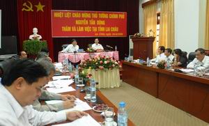 Làm việc với lãnh đạo Tỉnh ủy, HĐND, UBND tỉnh, Thủ tướng Nguyễn Tấn Dũng và các thành viên Đoàn công tác Chính phủ cho rằng: Mặc dù nhiều khó khăn như địa hình dốc, phân cắt phức tạp, đất đai rộng, nhưng thiếu đất sản xuất, quy mô kinh tế nhỏ bé, phần lớn là tự cấp, tự túc, sản xuất hàng hóa nhỏ bé, phân tán, cơ cấu kinh tế chuyển dịch chậm, tỷ lệ hộ đói nghèo cao (31,2% theo tiêu chuẩn cũ, tương đương 65% theo chuẩn mới), mặt bằng dân trí và chất lượng lao động thấp, song 4 năm qua, từ khi tách tỉnh đến nay, GDP của Lai Châu liên tục tăng, an ninh lương thực được đảm bảo, bình quân lương thực đầu người đạt 408 kg/năm; 100% số xã có điện thoại đến trung tâm xã, 60% số hộ được xem truyền hình. Tỉnh có quan hệ hữu nghị tốt với tỉnh Vân Nam (Trung Quốc). Nhìn chung, Lai Châu đạt kết quả khá đồng đều trên hầu hết các lĩnh vực kinh tế, văn hóa, xã hội; an ninh, chính trị, trật tự, an toàn xã hội được giữ vững; đời sống nhân dân từng bước được cải thiện.