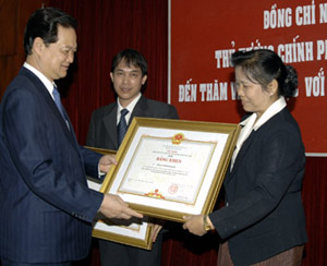 Thủ tướng Nguyễn Tấn Dũng trao bằng khen cho cán bộ Ngân hàng Liên doanh Việt - Lào. Ảnh Cổng TTĐT Chính phủ