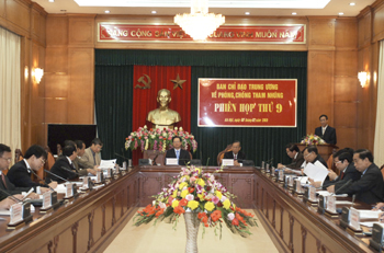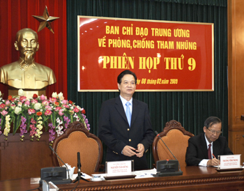 |  | | Phiên họp thứ 9 của Ban Chỉ đạo Trung ương về phòng, chống tham nhũng - Ảnh: Chinhphu.vn | Tại phiên họp này, Thủ tướng Nguyễn Tấn Dũng yêu cầu các cấp, các ngành phải luôn coi công tác đấu tranh phòng, chống tham nhũng là nhiệm vụ vừa cấp bách, vừa lâu dài, công tác này phải được tiến hành cương quyết, kiên trì và liên tục với những bước đi vững chắc, tích cực và có trọng tâm, trọng điểm. Tạo bước chuyển biến tích cực hơn nữa trong đấu trang phòng chống tham nhũng Theo Thủ tướng Nguyễn Tấn Dũng, trong năm 2009, các cấp, các ngành cần tiếp tục tăng cường thực hiện đồng bộ và hiệu quả các giải pháp trong đấu tranh phòng, chống tham nhũng nhằm tạo bước chuyển biến tích cực hơn nữa đối với công tác này. Đấu tranh phòng chống tham nhũng cần gắn liền với hoạt động tuyên truyền, giáo dục, học tập Nghị quyết Trung ương 3 (Khóa X) về tăng cường sự lãnh đạo của Đảng đối với công tác phòng, chống tham nhũng; Luật Phòng, chống tham nhũng và Luật Thực hành tiết kiệm, chống lãng phí. Chỉ đạo, đôn đốc xây dựng mới và ban hành các văn bản nhằm hoàn thiện thể chế theo chương trình, kế hoạch đã đề ra; rà soát các văn bản đã ban hành để xem xét, điều chỉnh, sửa đổi bổ sung kịp thời nhằm giải quyết những vướng mắt trong quá trình thực hiện, nhất là các văn bản liên quan đến quản lý và sử dụng đất đai, quản lý đầu tư xây dựng cơ bản, sử dụng tài sản công, chi tiêu công... Về chống tham nhũng, khi đã phát hiện xác định rõ các vụ án, vụ việc tham nhũng thì cần khẩn trương xử lý nghiêm minh, đúng pháp luật, đúng đối tượng, không để lọt tội, không làm oan sai cho người vô tội, coi việc xử lý kiên quyết, triệt để các vụ án, vụ việc tham nhũng là một hình thức răn đe, phòng ngừa tham nhũng. Thủ tướng Nguyễn Tấn Dũng yêu cầu, trong thời gian tới, các cơ quan chức năng về thanh tra, kiểm tra, kiểm toán, điều tra, truy tố và xét xử cần có sự phối hợp chặt chẽ hơn nữa trong đấu tranh phòng, chống tham nhũng. Trước một vụ án, một vụ việc tham nhũng, các cơ quan chức năng cần làm tốt công tác cung cấp thông tin cho báo chí nhằm định hướng dư luận, đảm bảo tính chính thống, tính công khai, minh bạch của các thông tin được đưa ra từ các cơ quan chức năng, tránh tình trạng thông tin không chính thống gây sự hiểu lầm trong nhân dân cho rằng sự việc được bưng bít, các hoạt động công tác điều tra, truy tố, xét xử cũng chỉ là "đầu voi đuôi chuột". Thủ tướng Nguyễn Tấn Dũng giao các thành viên Ban Chỉ đạo tiếp tục hoàn thiện các quy định, giải pháp về bảo vệ người tố cáo và cương quyết đấu tranh chống tham nhũng cũng như các quy định xử lý sai phạm đối với những các cá nhân lợi dụng đưa tin tố cáo không đúng sự thực. Ngoài ra, Thủ tướng cũng bày tỏ đồng tình với một số nhiệm vụ trọng tâm trong quý I/2009 Ban Chỉ đạo đã đề ra là: xử lý dứt điểm các vụ án còn lại trong 8 vụ án trọng điểm; đôn đốc đẩy nhanh tiến độ và đảm bảo chất lượng xử lý đối với 15 vụ án tham nhũng nghiêm trọng, phức tạp; tiếp tục xác minh, làm rõ những vụ việc tham nhũng có dấu hiệu nghiêm trọng để xử lý; hướng dẫn các Ban Chỉ đạo cấp tỉnh về phòng, chống tham nhũng rà soát, lập danh mục để phối hợp giải quyết đối với các vụ án tham nhũng tại địa phương. |  | | Thủ tướng Chính phủ Nguyễn Tấn Dũng: Đảm bảo công tác phòng, chống tham nhũng ngày càng phát huy hiệu quả và đi và chiều sâu chất lượng - Ảnh: Chinhphu.vn | Kết quả phát hiện và xử lý các hành vi tham nhũng trong năm 2008 Đối với 8 vụ án trọng điểm đã tiến hành xét xử 7 vụ, gồm: vụ đất đai ở Đồ Sơn (Hải Phòng), vụ Mai Văn Dâu, vụ Mạc Kim Tôn, vụ Lương Cao Khải, vụ Nguyễn Lâm Thái, vụ PMU 18 (mảng đánh bạc); vụ Nguyễn Đức Chi (mảng hợp đồng mua bán gạo ở Trà Vinh). Đối với vụ Điện kế điện tử Thành phố Hồ Chí Minh: Hội nghị liên ngành đã thống nhất đưa ra xét xử trước ngày 15/2/2009; mảng điều tra mở rộng từ vụ PMU 18 và mảng làm, sử dụng giấy tờ giả trong vụ Nguyễn Đức Chi đang được các cơ quan tố tụng chuẩn bị đưa ra xét xử. Đối với 15 vụ án nghiêm trọng, phức tạp: đã đưa ra xét xử sơ thẩm 1 vụ (vụ Thiên Lợi Hòa); 4 vụ đã kết luận điều tra, chuẩn bị đưa ra xét xử (vụ đất Quán Nam ở Hải Phòng, vụ Tổng Công ty Mía đường II, vụ Công ty Vinaconex 10, vụ Sở Quản lý kinh doanh vốn và ngoại tệ-Ngân hàng Nông nghiệp và Phát triển nông thôn); 4 vụ đang chuẩn bị kết luận điều tra (vụ tượng đài Chiến thắng Điện Biên Phủ, vụ Đề án 112, vụ Nông trường Sông Hậu, vụ than Quảng Ninh); 6 vụ đang đang khẩn trương tiến hành điều tra. Việc điều tra, truy tố, xét xử các vụ án trên đều đảm bảo đúng quy định của pháp luật. Trong năm 2008, toàn ngành Thanh tra đã triển khai trên 11.400