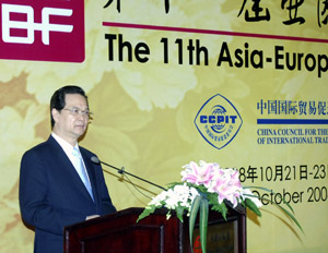 Đến dự và phát biểu tại Diễn đàn Doanh nghiệp Á-Âu (AEBF-11) tổ chức tại Khách sạn China World, Thủ tướng hoan nghênh và tán thành chủ đề của Diễn đàn năm nay “Nắm bắt xu thế, Thời điểm hành động và Quan hệ đối tác công-tư”, cho rằng “Các vấn đề mà Diễn đàn tập trung thảo luận trong 2 ngày qua cho thấy cộng đồng doanh nghiệp Á-Âu đã nhận thức được sứ mệnh của mình trong thời điểm cực kỳ quan trọng này đối với sự phát triển và phồn vinh của cả hai châu lục”.