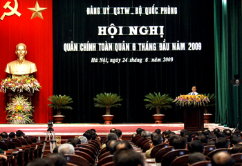 | Thay mặt Lãnh đạo Đảng và Nhà nước, Thủ tướng Nguyễn Tấn Dũng nhiệt liệt biểu dương những nỗ lực của toàn thể cán bộ, chiến sĩ, công nhân viên chức quốc phòng, xứng đáng với lòng yêu mến, tin cậy của Đảng, Nhà nước, nhân dân ta và gửi lời thăm hỏi, lời chúc tốt đẹp đến toàn thể tướng lĩnh, sĩ quan, chiến sĩ QĐND Việt Nam anh hùng. | | Ảnh: Chinhphu.vn | Thủ tướng cho rằng: Quân đội đã hoàn thành tốt nhiệm vụ trong mọi tình huống, hoàn cảnh, góp phần giữ vững ổn định chính trị - xã hội, bảo vệ vững chắc chủ quyền, toàn vẹn lãnh thổ và lợi ích quốc gia. Quân đội tham gia tích cực và có hiệu quả vào các chương trình phát triển kinh tế - xã hội, xóa đói và giảm nghèo, xây dựng đời sống văn hóa mới, nhất là ở vùng sâu, vùng xa, biên giới, hải đảo. Quân đội, Công an là những lực lượng nòng cốt trong cứu hộ, cứu nạn, phòng, chống và khắc phục hậu quả thiên tai, dịch bệnh… Đảng, Nhà nước và nhân dân ta đánh giá cao những thành tích và sự cống hiến của Quân đội; luôn phấn khởi, tự hào trước mỗi bước phát triển, trưởng thành của Quân đội, đồng thời gửi gắm lòng yêu mến, tin cậy vào Quân đội, vào lực lượng vũ trang nhân dân Việt Nam. Thủ tướng khẳng định, việc bảo đảm quốc phòng an ninh, giữ vững độc lập chủ quyền thống nhất toàn vẹn lãnh thổ, ổn định chính trị, đảm bảo trật tự an toàn xã hội...là điều kiện có ý nghĩa quyết định để phát triển kinh tế xã hội đất nước. “Không có sự bảo đảm độc lập chủ quyền, toàn vẹn lãnh thổ thì không thể xây dựng và phát triển đất nước”, Thủ tướng nói. Đồng thời, việc phát triển KT- XH ngày càng cao cũng là điều kiện cơ bản để đảm bảo vững chắc quốc phòng an ninh, trật tự xã hội. Đảm bảo quốc phòng an ninh là nhiệm vụ chính trị thường xuyên của toàn Đảng, toàn quân, toàn hệ thống chính trị. Quân đội nhân dân lực lượng tham mưu, nòng cốt trong sự nghiệp xây dựng quốc phòng toàn dân, bảo vệ Tổ quốc Việt Nam XHCN. Sau khi phân tích những nét chính của tình hình kinh tế - xã hội đất nước từ năm 2008 đến nay, Thủ tướng nêu rõ: Trước những diễn biến phức tạp của tình hình thế giới, khủng hoảng tài chính, suy thoái kinh tế toàn cầu, thiên tai, dịch bệnh, với sự nỗ lực, quyết liệt của toàn Đảng, toàn quân, toàn dân, Việt Nam đã cơ bản kiềm chế được lạm phát, ngăn chặn suy giảm kinh tế, duy trì đà tăng trưởng hợp lý và, bảo đảm quốc phòng, an ninh, ổn định chính trị - xã hội, từng bước nâng cao đời sống nhân dân. “Những thành tựu của đất nước ta đạt được có sự đóng góp rất lớn của quân đội trên nhiều lĩnh vực”, Thủ tướng đánh giá và mong muốn Quân đội tiếp tục phát huy và có nhiều đóng góp hơn nữa. Trên tinh thần xây dựng QĐND Việt Nam anh hùng, chính qui, tinh nhuệ, từng bước hiện đại, đảm bảo hoàn thành tốt các nhiệm vụ được giao phó, trong những tháng cuối năm 2009 và những năm tiếp theo, Thủ tướng nhấn mạnh đến việc triển khai đồng bộ, toàn diện các giải pháp đã đề ra. Trong đó chú trọng thực hiện tốt công tác xây dựng Đảng, xây dựng lực lượng, coi đây là nhiệm vụ then chốt, luôn sẵn sàng chiến đấu cao, thường xuyên cảnh giác, phối hợp chặt chẽ với lực lượng Công an đối phó kịp thời, thắng lợi với các tình huống phức tạp có thể xảy ra, không để bị động, bất ngờ. | | Toàn cảnh hội nghị - Ảnh: Chinhphu.vn | Cùng với đó chú trọng xây dựng "thế trận lòng dân" làm nền tảng phát huy sức mạnh tổng hợp bảo vệ Tổ quốc. Kết hợp kinh tế với quốc phòng, an ninh, đối ngoại trong điều kiện Việt Nam hội nhập ngày càng sâu rộng vào nền kinh tế thế giới. Phát huy sức mạnh tổng hợp của đất nước, của cả hệ thống chính trị, khối đoàn kết toàn dân tộc, xây dựng nền quốc phòng toàn dân, tăng cường tiềm lực và xây dựng thế trận quốc phòng. Củng cố khối đoàn kết giữa các dân tộc, chăm lo phát triển kinh tế - xã hội ở các vùng sâu, vùng xa, vùng cao, căn cứ cách mạng, vùng có nhiều dân tộc thiểu số; xây dựng sự đồng thuận xã hội. Tăng cường và nâng cao chất lượng, hiệu quả giáo dục quốc phòng theo tư duy mới về bảo vệ Tổ quốc. Thực hiện tốt việc xây dựng thế trận trên các địa bàn chiến lược, vùng sâu, vùng xa, biên giới, hải đảo. Tiếp tục đẩy mạnh việc nghiên cứu và triển khai thực hiện phương hướng xây dựng Quân đội nhân dân cách mạng, chính quy, tinh nhuệ, từng bước hiện đại đáp ứng các yêu cầu tác chiến trong chiến tranh bằng vũ khí công nghệ cao… Thủ tướng đề nghị Đảng bộ Quân đội tăng cường và nâng cao chất lượng công tác tư tưởng, đẩy mạnh Cuộc vận động "Học tập và làm theo tấm gương đạo đức Hồ Chí Minh". Ngoài ra, tăng cường công tác đào tạo nghề, quan tâm hơn nữa đến đời sống cán b