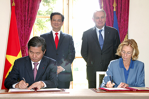 Hai Thủ tướng chứng kiến Bộ trưởng Bộ KHĐT Bùi Quang Vinh và Bộ trưởng Ngoại thương Pháp Nicole Bricq ký Nghị định thư tài chính cho dự án “Trang thiết bị Bệnh viện Cần Thơ”. Ảnh: VGP/Nhật Bắc