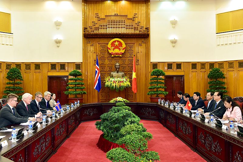 Bên cạnh đó, Thủ tướng đề nghị hai bên phối hợp xây dựng khuôn khổ pháp lý thúc đẩy hợp tác trong những lĩnh vực còn nhiều tiềm năng khác như giáo dục, khoa học kỹ thuật, văn hóa, du lịch,… Đồng thời mong muốn hai bên tiếp tục phối hợp lập trường, ủng hộ lẫn nhau ở các diễn đàn quốc tế nhất là ở Liên Hợp Quốc; đề nghị Iceland ủng hộ, thúc đẩy đàm phán và sớm đi tới ký kết Hiệp định Thương mại tự do giữa Việt Nam với Khối Mậu dịch tự do châu Âu (EFTA)…