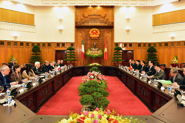 Thủ tướng Nguyễn Tấn Dũng nêu rõ Việt Nam đánh giá cao vai trò của Italy trong khu vực và trên thế giới, đồng thời mong muốn trên cơ sở quan hệ đối tác chiến lược, hai bên sẽ hợp tác chân thành trên tất cả các lĩnh vực từ kinh tế, thương mại, đầu tư; khoa học - công nghệ; giáo dục - đào tạo; văn hóa; du lịch; an ninh quốc phòng... Phấn đấu sớm đạt mục tiêu kim ngạch thương mại song phương lên mức 5 tỷ USD vào năm 2016 như Thủ tướng hai nước đã đề ra.