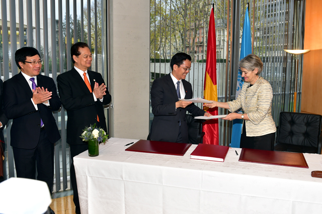 | Thủ tướng Nguyễn Tấn Dũng; Phó Thủ tướng, Bộ trưởng Ngoại giao Phạm Bình Minh chứng kiến Lễ ký Thỏa thuận chương trình hợp tác Việt Nam-UNESCO giai đoạn 2016-2020. Ảnh: VGP/Nhật Bắc |