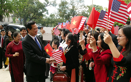 Cán bộ, nhân viên Đại sứ quán và cộng đồng người Việt tại Hoa Kỳ đón Thủ tướng Nguyễn Tấn Dũng và Phu nhân, cùng Đoàn cấp cao Việt Nam. Ảnh: VGP/Nhật Bắc