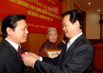 (Chinhphu.vn) – Sáng 24/8, Văn phòng Chính phủ tổ chức trang trọng Lễ trao tặng, truy tặng Huân chương Sao Vàng, Huân chương Hồ Chí Minh, Huân chương Độc Lập cho các đồng chí nguyên là lãnh đạo Chính phủ và VPCP. Thủ tướng Nguyễn Tấn Dũng, lãnh đạo VPCP, TƯ MTTQ Việt Nam, các Bộ, ngành, gia đình các đồng chí được trao tặng, truy tặng huân chương, cùng đông đảo cán bộ, chuyên viên Văn phòng Chính phủ tham dự buổi lễ.