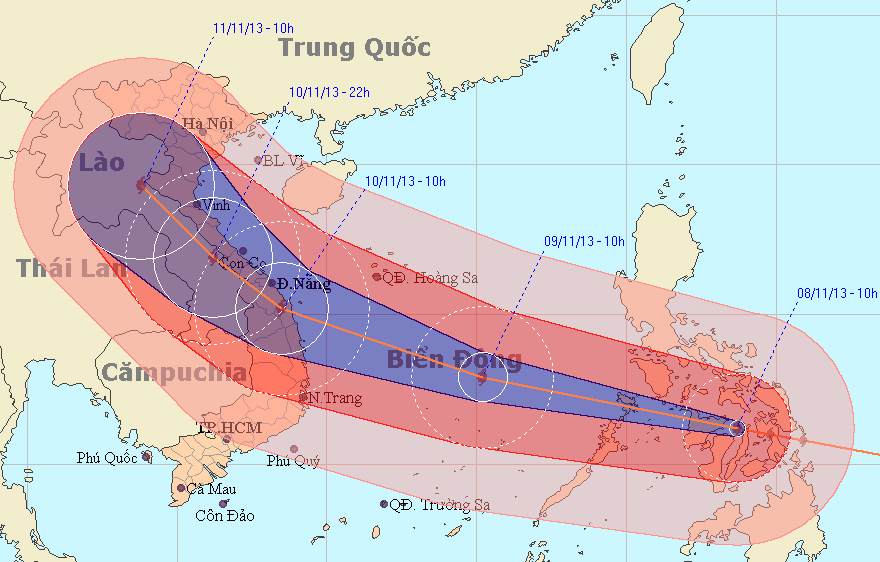Dự báo trong 24 giờ tới, bão di chuyển nhanh theo hướng giữa Tây và Tây Tây Bắc, mỗi giờ đi được khoảng 35 km. Đến 10h ngày 9/11, vị trí tâm bão vào khoảng 12,9 độ Vĩ Bắc; 115, 2 độ Kinh Đông, cách đảo Song Tử Tây (thuộc quần đảo Trường Sa) khoảng 190 km về phía Đông Đông Bắc. Sức gió gần nhất vùng tầm tâm bão mạnh cấp 16-17, giật trên cấp 17.