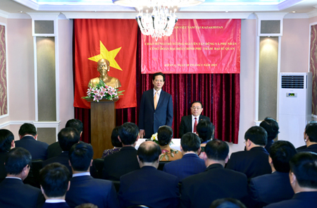 Thay mặt Chính phủ, Thủ tướng Nguyễn Tấn Dũng gửi lời thăm hỏi thân thiết cùng lời chúc tốt đẹp nhất đến cán bộ, nhân viên Đại sứ quán và cộng đồng người Việt Nam ở Kazakhstan.