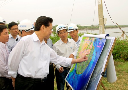 Thủ tường Nguyễn Tấn Dũng thị sát Dự án luồng cho tàu biển trọng tải lớn vào Sông Hậu và Dự án Trung tâm điện lực Duyên Hải. Ảnh: VGP/Nhật Bắc