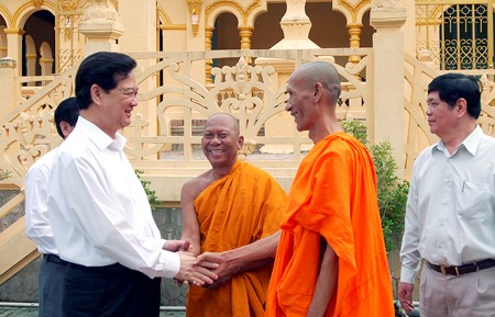 Cũng trong sáng 3/1, Thủ tướng Nguyễn Tấn Dũng đã tới thăm, tặng quà, chúc mừng năm mới các vị chức sắc tôn giáo của Hội đồng Trị sự Giáo hội Phật giáo tỉnh Trà Vinh tại chùa Angarrã Japurĩ (chùa Âng).