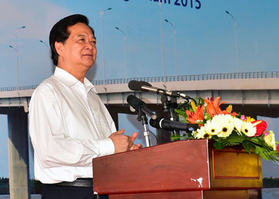 Thủ tướng Nguyễn Tấn Dũng biểu dương các bộ, ngành, địa phương, các đơn vị và người lao động đã ngày đêm góp công sức để cây cầu hoàn thành sớm hơn tiến độ và nhất là hiện thực hóa ước mơ của nhân dân địa phương từ bao đời nay. Ảnh: VGP/Nhật Bắc