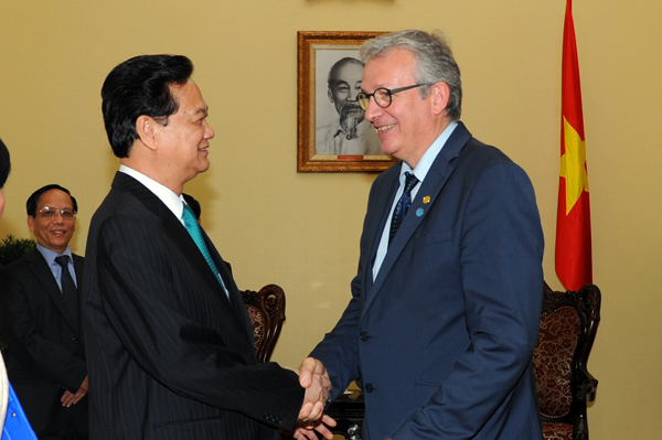Thủ tướng Nguyễn Tấn Dũng và Bí thư toàn quốc Đảng Cộng sản Pháp Pierre Laurent. Ảnh: VGP/Nhật Bắc.