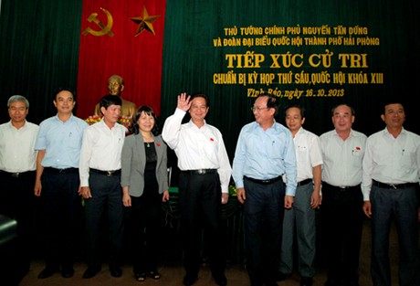 Thủ tướng Nguyễn Tấn Dũng cũng đề nghị Đoàn đại biểu Quốc hội thành phố Hải Phòng tổng hợp các ý kiến, kiến nghị của cử tri tại buổi tiếp xúc để chuyển đến các Bộ, ngành chức năng xem xét, giải quyết.