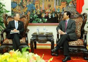| | Thủ tướng Nguyễn Tấn Dũng tiếp Chủ tịch JETRO (Nhật Bản) Yasuo Hayashi - Ảnh Website Chính phủ | Thủ tướng Nguyễn Tấn Dũng đánh giá cao sự đóng góp của JETRO trong hợp tác kinh tế, thương mại, đầu tư giữa hai nước. Thủ tướng mong muốn, JETRO tiếp tục thúc đẩy mạnh mẽ việc triển khai thực hiện 3 dự án lớn tại Việt Nam là Đường sắt cao tốc Bắc – Nam, Đường bộ cao tốc Bắc – Nam và Khu Công nghệ cao Hòa Lạc và những dự án quan trọng khác như xây dựng tuyến tàu điện ngầm tại Hà Nội và thành phố Hồ Chí Minh, nâng kim ngạch thương mại song phương lên cao hơn nữa. Thủ tướng Nguyễn Tấn Dũng đề nghị hai bên đẩy nhanh tiến độ đàm phán Hiệp định đối tác kinh tế song phương (EPA) và tích cực triển khai giai đoạn 3 sáng kiến chung Việt – Nhật về cải thiện môi trường đầu tư tại Việt Nam. Sau 10 năm mới trở lại thăm Việt Nam, ông Yasuo Hayashi đánh giá cao sự phát triển kinh tế năng động của Việt Nam, trân trọng cảm ơn Thủ tướng Nguyễn Tấn Dũng đã dành thời gian tiếp Đoàn. Chủ tịch JETRO khẳng định, sẽ làm hết sức mình để thúc đẩy hợp tác kinh tế, thương mại hai bên lên tầm cao mới. Ông cho biết, để mở rộng giao thương giữa doanh nghiệp hai nước và nhân dịp kỷ niệm 35 năm thiết lập quan hệ Việt Nam – Nhật Bản, JETRO và Cục Xúc tiến Thương mại Việt Nam sẽ tổ chức tọa đàm cho doanh nghiệp hai bên vào tháng 9/2008. Việt Đông |