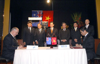 Thủ tướng Nguyễn Tấn Dũng và Đoàn cấp cao Chính phủ Việt Nam chứng kiến lễ ký thỏa thuận hợp tác giữa Phòng Thương mại và Công nghiệp Việt Nam với Phòng Thương mại và Công nghiệp bang Victoria - Ảnh: Cổng TTĐT Chính phủ