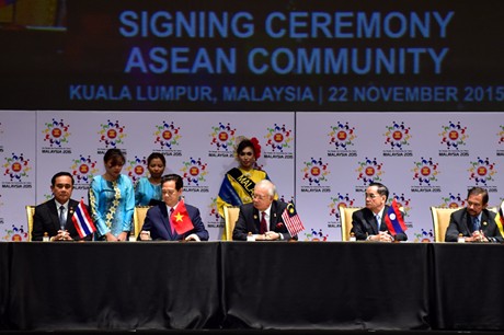 Thủ tướng Nguyễn Tấn Dũng và các nhà lãnh đạo ASEAN ký Tuyên bố Kuala Lumpur về việc hình thành Cộng đồng ASEAN. Ảnh: VGP/Nhật Bắc