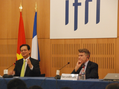 Ngài Viện trưởng Thierry de Montbrial, Giám đốc điều hành, IFRI đón đợi Thủ tướng Nguyễn Tấn Dũng và Đoàn đại biểu Việt Nam ngay cửa chính chỗ đỗ ô tô. Cung cách ông tự nhiên, thân tình cứ như từng quen biết nhau mặc dầu mới lần đầu gặp.