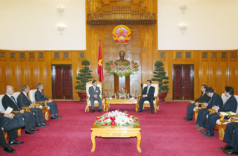 (Chinhphu.vn) - Sáng 25/7, tại Trụ sở Chính phủ, Thủ tướng Nguyễn Tấn Dũng tiếp ông Takahasi Kyohei, ông Nakamura Kunihira, đồng Chủ tịch Ủy ban Kinh tế Nhật-Việt thuộc Liên đoàn các Tổ chức kinh tế Nhật Bản (Keidanren).