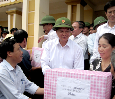 (Chinhhphu.vn) - Kiểm tra, chỉ đạo công tác khắc phục hậu quả lũ lụt tại miền Trung, Thủ tướng Nguyễn Tấn Dũng nhấn mạnh Đảng và Nhà nước sẽ hết lòng ủng hộ, hỗ trợ đồng bào bị thiên tai, yêu cầu lãnh đạo các địa phương, các, ban ngành cùng các lực lượng liên quan sát cánh, chung tay giúp dân.