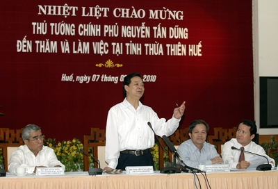 (Chinhphu.vn) – Thăm chúc Tết Đảng bộ, chính quyền và nhân dân Thừa Thiên-Huế ngày 7/2, Thủ tướng Nguyễn Tấn Dũng yêu cầu, cần phấn đấu xây dựng Thừa Thiên-Huế thành trung tâm của khu vực miền Trung, đồng thời là một trong những trung tâm lớn, đặc sắc của cả nước về văn hóa, du lịch, khoa học – công nghệ, y tế…