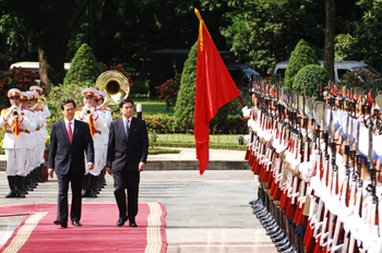 (Chinhphu.vn)- Nhận lời mời của Thủ tướng Chính phủ Nguyễn Tấn Dũng, ngày 10/7/2009 Thủ tướng Chính phủ Vương quốc Thái Lan Abhisit Vejjajiva đã thăm chính thức Việt Nam. Sau lễ đón chính thức được tổ chức trọng thể tại Phủ Chủ tịch, Thủ tướng Chính phủ Nguyễn Tấn Dũng đã hội đàm với Thủ tướng Vương quốc Thái Lan tại Trụ sở Chính phủ.