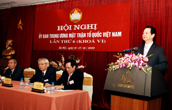 (Chinhphu.vn) - Thủ tướng Chính phủ Nguyễn Tấn Dũng cho rằng, trong năm 2009 với nhiều khó khăn, thách thức, đòi hỏi sự phối hợp chặt chẽ hơn nữa giữa Chính phủ và Ủy ban Trung ương Mặt trận Tổ quốc Việt Nam (MTTQVN) góp phần tạo sức mạnh tổng hợp để ngăn chặn suy giảm kinh tế, duy trì tăng trưởng ở mức 6,5%, đảm bảo an sinh xã hội...