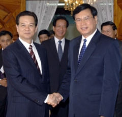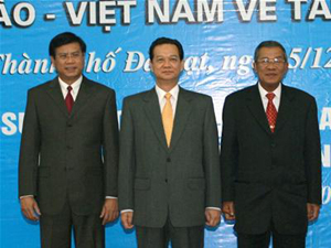(Cổng TTĐT Chính phủ) - Như tin đã đưa, theo lời mời của Thủ tướng nước CHDCND Lào Bouasone Bouphavanh, chiều 25/11, Thủ tướng Nguyễn Tấn Dũng và Phu nhân cùng Đoàn đại biểu cấp cao Chính phủ Việt Nam đã đến Thủ đô Viêng-chăn dự Hội nghị lần thứ 5 về Tam giác phát triển CLV. Ngay sau khi đến Thủ đô Viêng-chăn, Thủ tướng Nguyễn Tấn Dũng đã có cuộc gặp, trao đổi với Thủ tướng Bouasone Bouphavanh.