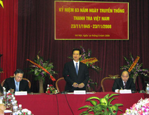 (Cổng TTĐT Chính phủ) – Sáng 19/11 tại Hà Nội, Thanh tra Chính phủ đã tổ chức kỷ niệm 63 năm ngày truyền thống ngành Thanh tra (23/11/1945-23/11/2008). Thủ tướng Chính phủ Nguyễn Tấn Dũng đã tới dự và chỉ đạo cụ thể đối với công tác thanh tra trong thời gian tới.