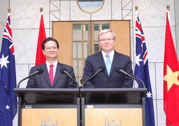 (Cổng TTĐT Chính phủ) – Như Cổng TTĐT Chính phủ đã đưa tin, ngay sau Lễ đón chính thức trọng thể tại Quảng trường Nhà Quốc hội Australia, sáng 13/10, Thủ tướng Nguyễn Tấn Dũng đã dẫn đầu Đoàn cấp cao Chính phủ Việt Nam hội đàm với Đoàn cấp cao Chính phủ Australia do Thủ tướng Kevin Rudd dẫn đầu. Hai bên nhất trí cùng nhau đẩy mạnh hợp tác toàn diện hơn, hiệu quả hơn và thiết thực hơn.