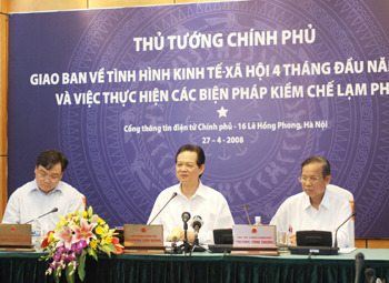 (Cổng TTĐT Chính phủ) - Hôm nay (27/4/2008), cuộc giao ban truyền hình trực tuyến của Thủ tướng Nguyễn Tấn Dũng với các Bộ, ngành và 8 tỉnh, thành phố ở cả 3 miền về tình hình kinh tế - xã hội 4 tháng đầu năm, việc thực hiện các biện pháp kiềm chế lạm phát bắt đầu vào lúc 8h sáng và kéo dài hơn 4 giờ. Nhiều vấn đề bức thiết của mỗi địa phương được nêu ra và được Thủ tướng chỉ đạo giải quyết ngay, cụ thể.