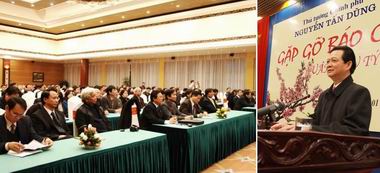 (Website Chính phủ) – Sáng 13/2, Thủ tướng Nguyễn Tấn Dũng và các Phó Thủ tướng Nguyễn Sinh Hùng, Phạm Gia Khiêm, Trương Vĩnh Trọng, Hoàng Trung Hải, Nguyễn Thiện Nhân đã chủ trì phiên họp Thường trực Chính phủ đầu Xuân Mậu Tý. Thủ tướng Nguyễn Tấn Dũng đã phê bình Chủ tịch UBND một số tỉnh, thành phố để tái diễn tình trạng đốt pháo, gia tăng tai nạn giao thông trong dịp Tết Mậu Tý.