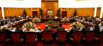 (Website Chính phủ) – Chủ trì phiên họp Chính phủ thường kỳ cuối cùng của năm 2007 trong hai ngày 23 – 24/12, Thủ tướng Nguyễn Tấn Dũng nhấn mạnh đến việc tháo gỡ các khó khăn ngay từ đầu năm 2008, kiểm soát giá cả, xây dựng cơ chế, chính sách, đẩy mạnh cải cách thủ tục hành chính, phòng chống tham nhũng, lãng phí, phát triển kinh tế - xã hội bền vững, phấn đấu GDP tăng 9%.