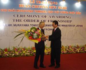 (Website Chính phủ) – Chiều 5/9, Thủ tướng Chính phủ Nguyễn Tấn Dũng đã thay mặt Đảng, Nhà nước, Chính phủ Việt Nam trao tặng Huân chương Hữu nghị cho cựu Thủ tướng Nhật Bản Murayama Tomichi vì những đóng góp tích cực của ông vào việc phát triển mối quan hệ hữu nghị truyền thống giữa hai nước Việt Nam-Nhật Bản.